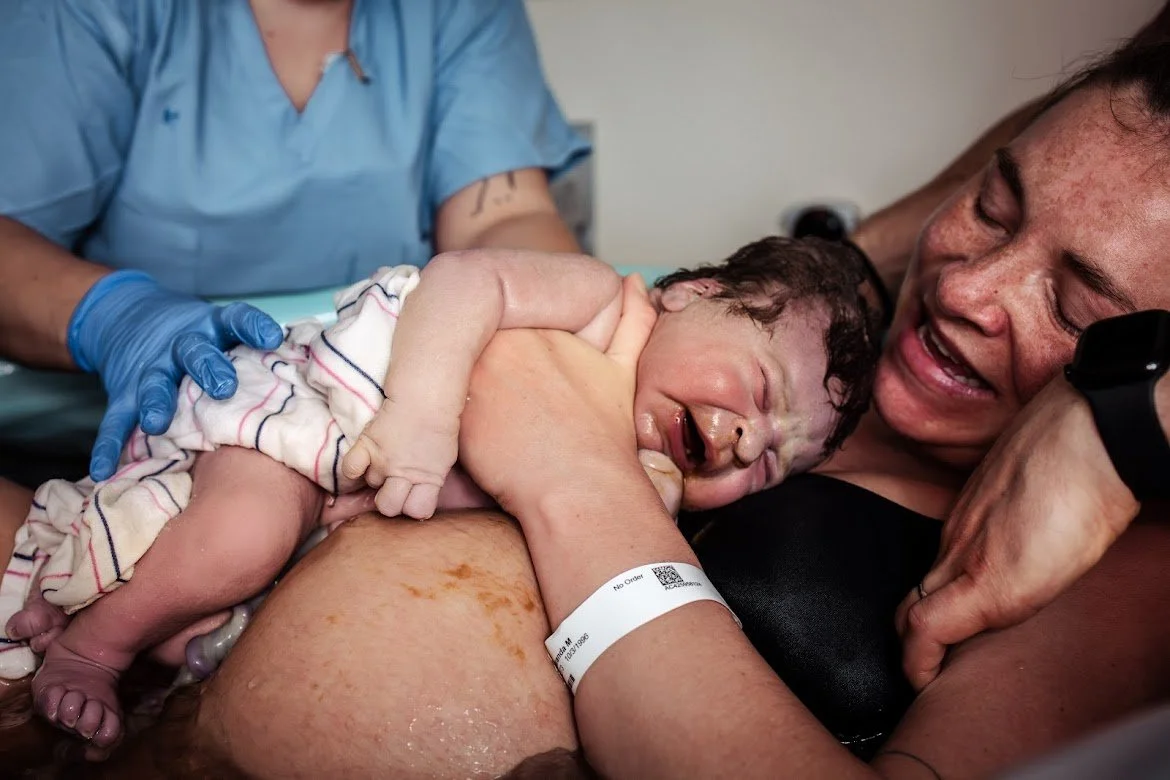 94 degrees Fahrenheit - felt warm but not too warm. Immediately, the water became a relief for the contractions that I was feeling from my ribs to my pelvic floor. I began pushing with my knees on the birth pool floor and hands on the side of the pool - alternating between knees in, knees out, and single leg side lunge. After about an hour, the Midwife and Jillian suggested a new position. They held a flat sheet and had me put my feet up on the wall of the pool. In a squatting position, I curled my abs for 3-4 pushes per contraction. This position intensified the sensations twofold - I was losing my breath by the end of each contraction. We did this position for 5-6 contractions before trying another. Next, we submerged a birthing “chair”. I sat on the edge and held my knees with my hands. My husband held me under my arms from behind while I leaned against the wall of the tub and curled my abdomen and tucked my chin into my chest with each contraction. While the pushing sensations were really intense in this position, too, I could tell we were going to make progress here. I stuck with this position from here on out, only taking a short break to be on my hands and knees once my lower back got sore. It was taking a long time for baby to get past my pubic bone. With each push, he would progress and recede. I was getting really tired after 2 hours or so. I was offered a cervical check to help inform our progress and decide on next steps. Baby was in +2 position, meaning 2 cm above the narrowest part of the pelvis. Crowning happens at +3 to +5. The Midwife suggested “guided pushing”, and Jillian agreed it would be worth trying considering my energy levels. I had some apple juice for quick sugar hit, but I was not interested in food. Guided pushing upped the intensity even more, but I could feel the progress we were making internally with small “pops” as baby moved through the birth canal. The Midwife told me to reach down and feel his head, which was only a few cm inside my vagina. I could feel his hair. Within 15-20 minutes, his head was crowning. The Midwife kept pressure on my perineum while we waited for the next contraction - it seemed like a long pause. The contractions came, and his head came out on the first push. It took 3 more pushes for his shoulder and body - all from the same contraction. The Midwife had to help maneuver his shoulder out a bit.